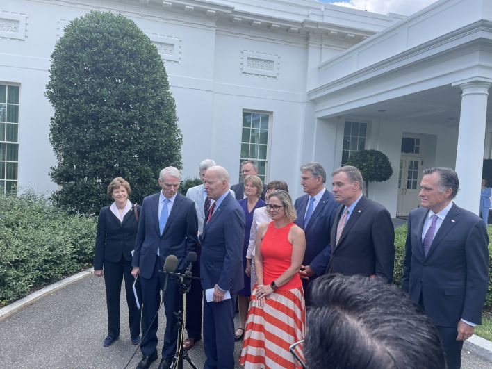 Durante la conferencia de prensa de infoestructura de Biden, una foto de una Kamala Haris de aspecto obviamente enojado agachada detrás de un pilar con los brazos cruzados sorprendió a Internet.