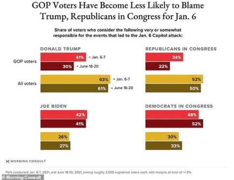 Morning Consult publicó la encuesta el lunes 28 de junio, indicando que el 41% de los votantes republicanos creían que Biden es responsable del 1 de enero. 6 Ataque al Capitolio, mientras que solo el 30% culpó a Trump.