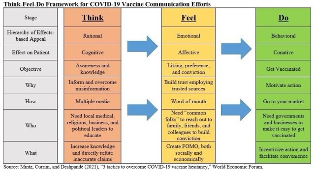 El Foro Económico Mundial afirma que «creen que la aplicación del enfoque centrado en el paciente «pensar, sentir y hacer» al problema de la comunicación de la vacuna COVID-19 mejorará los esfuerzos para acelerar la inmunidad mundial del rebaño. Garantizar una reapertura y recuperación económica segura y superar este importante desafío sanitario y económico podrían depender de tales tácticas».