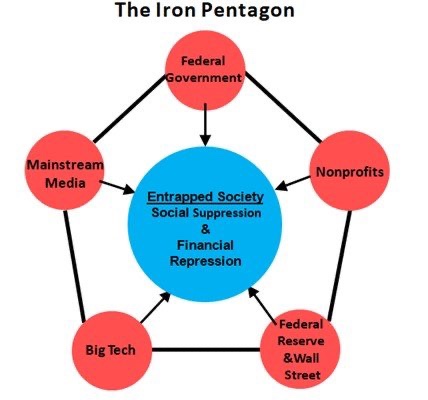 La actualización del triángulo de hierro para el panorama político actual lo expande en un pentágono multidimensional. Los nodos del Pentágono de Hierro son el Gobierno Federal, las organizaciones sin fines de lucro, la Reserva Federal y Wall Street, Big Tech y Mainstream Media. Estas entidades en connivencia erosionan la libertad personal, la propiedad personal, la propiedad inmobiliaria y los derechos de propiedad intelectual que son los cuatro pilares de la sociedad occidental moderna. El Pentágono de Hierro atrapa a la población despojando su agencia y transfiriendo su riqueza.