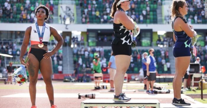 En las pruebas olímpicas de pista y campo la semana pasada, la lanzadora de martillo Gwen Berry, quien clasificó para su segundo equipo olímpico de Estados Unidos, tras haber conseguido su triunfo se alejó de la bandera de Estados Unidos cuando entonaron el himno nacional.