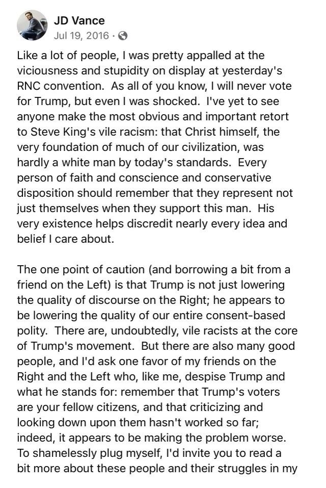 Durante la CNR en 2016, Vance fue despiadado en sus ataques a Donald Trump.