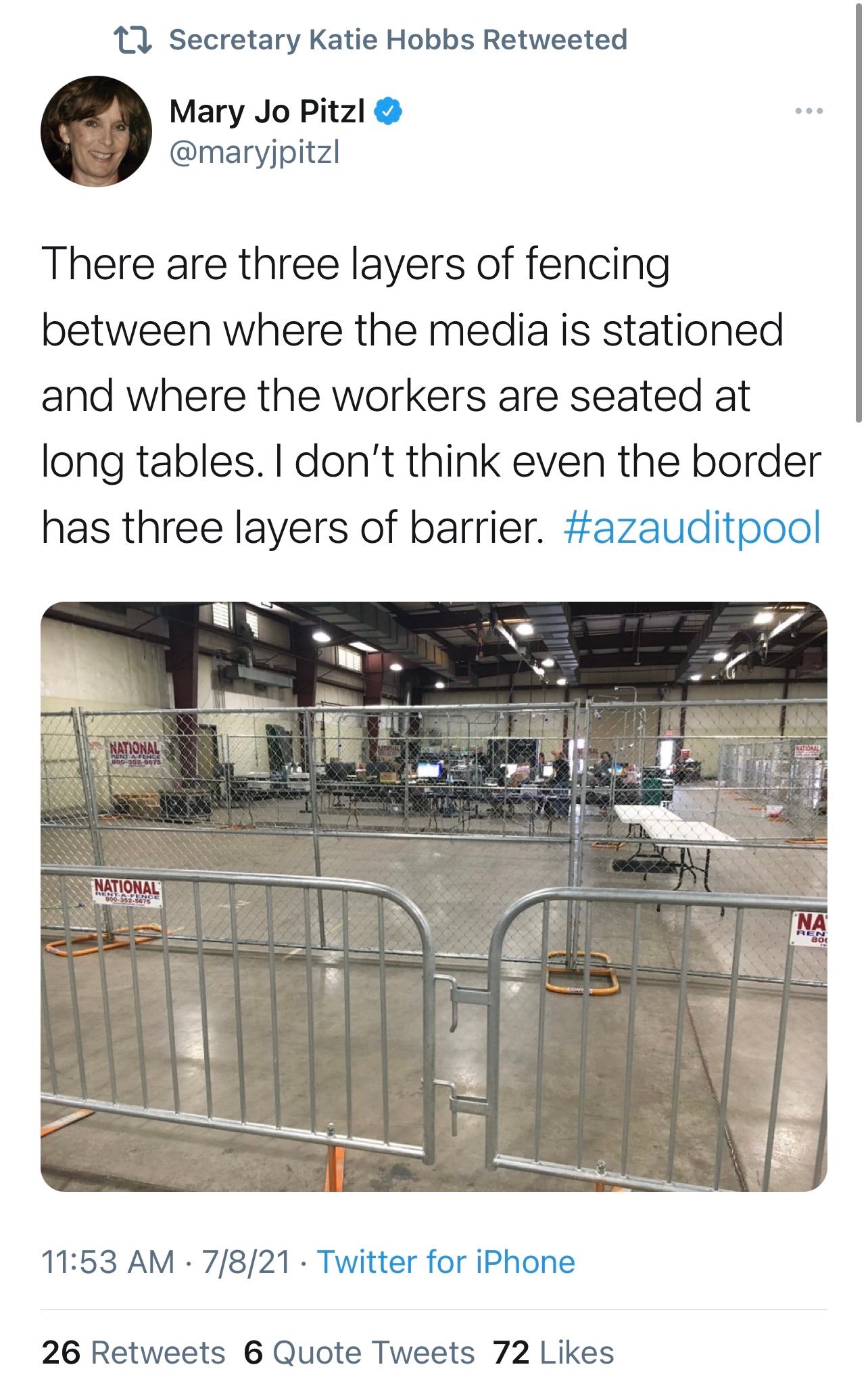 La reportera izquierdista de Arizona Mary Jo Pitzltweeted hoy sobre los continuos esfuerzos de auditoría en el Edificio Wesley Bolin en Phoenix.