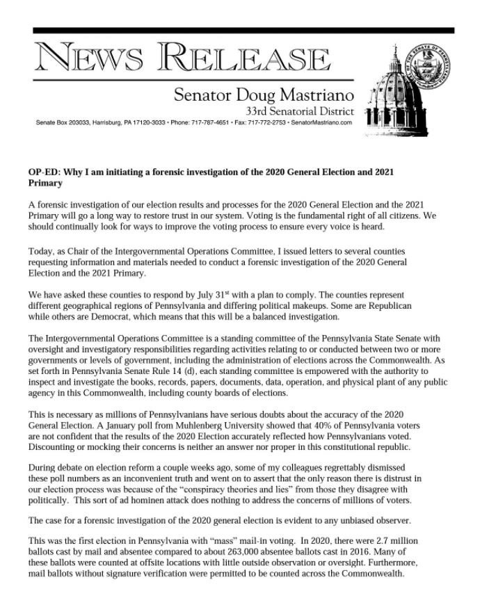 El Senador Doug Mastriano emitió una declaración el miércoles por la mañana. El senador estatal de Pensilvania anunció que está iniciando una investigación forense de las elecciones generales de 2020 y las primarias de 2021.