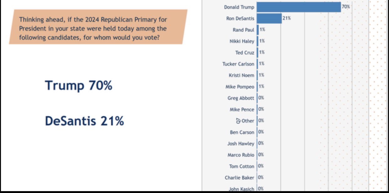 El gobernador de Florida. Ron DeSantis llegó en un distante segundo lugar, con un 21%. Nadie más entre los 19 posibles contendientes republicanos de la Casa Blanca de 2024 superó el 1%.