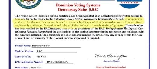 La certificación EAC de Dominion Democracy Suite 5.5C enumera específicamente las tabletas Android como hardware ***UNALTERED*** Consumer Off The Shelf (COTS) como probado y certificado. Específicamente, esto significa que vino con una batería y fue probado y certificado con una batería. Por lo tanto, la extracción de la batería alteraría indiscutiblemente el hardware a un estado no probado y, por lo tanto, descertificado.