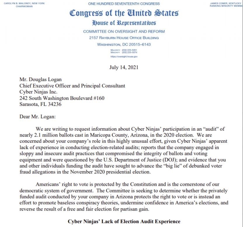 Aquí está la carta de 13 páginas enviada a los Cyber Ninjas por los demócratas de supervisión de la Cámara.
