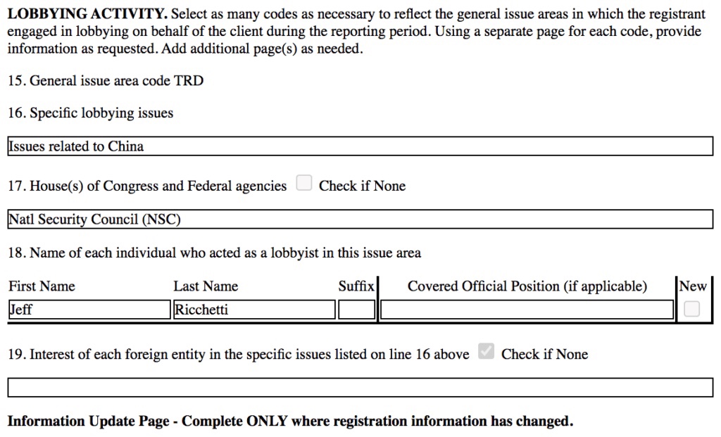El formulario muestra que Ricchetti fue contratado para presionar a la Casa Blanca de Biden sobre «Cuestiones relacionadas con China» y presiona al Consejo de Seguridad Nacional de la Casa Blanca.