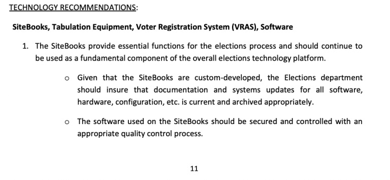 «A medida que los miembros del grupo de trabajo aprendieron más sobre las operaciones, determinaron que sería importante destacar el Sistema de Acceso al Registro de Votantes (VRAS). Esta es la base de datos central que es utilizada tanto por la Oficina del Registrador como por el Departamento de Elecciones a lo largo de cada ciclo electoral. El VRAS es fundamental para varias funciones críticas que involucran a ambas oficinas, es decir, el acceso en tiempo real a la información actualizada del registro de votantes, la creación de mapas de votación, la presentación de candidatos para informes financieros trimestrales, la preparación de la boleta electoral, la gestión del lugar de votación con formularios de acuerdo de instalaciones, así como la base de datos necesaria para generar varios informes y listas que incluyen: el informe bilingüe del trabajador electoral, la información de los votantes tempranos, la información de los votantes militares y los datos necesarios para el proveedor externo Runbeck. Este proveedor realiza la impresión, distribución, embalaje y seguimiento de las papeletas electorales oficiales tanto para la Oficina del Registrador como para el Departamento de Elecciones».