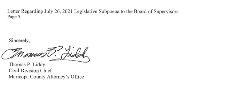 El abogado del condado de Maricopa, Allister Adel, escribió una respuesta más contundente en nombre del condado. La respuesta se puede resumir de la siguiente manera: