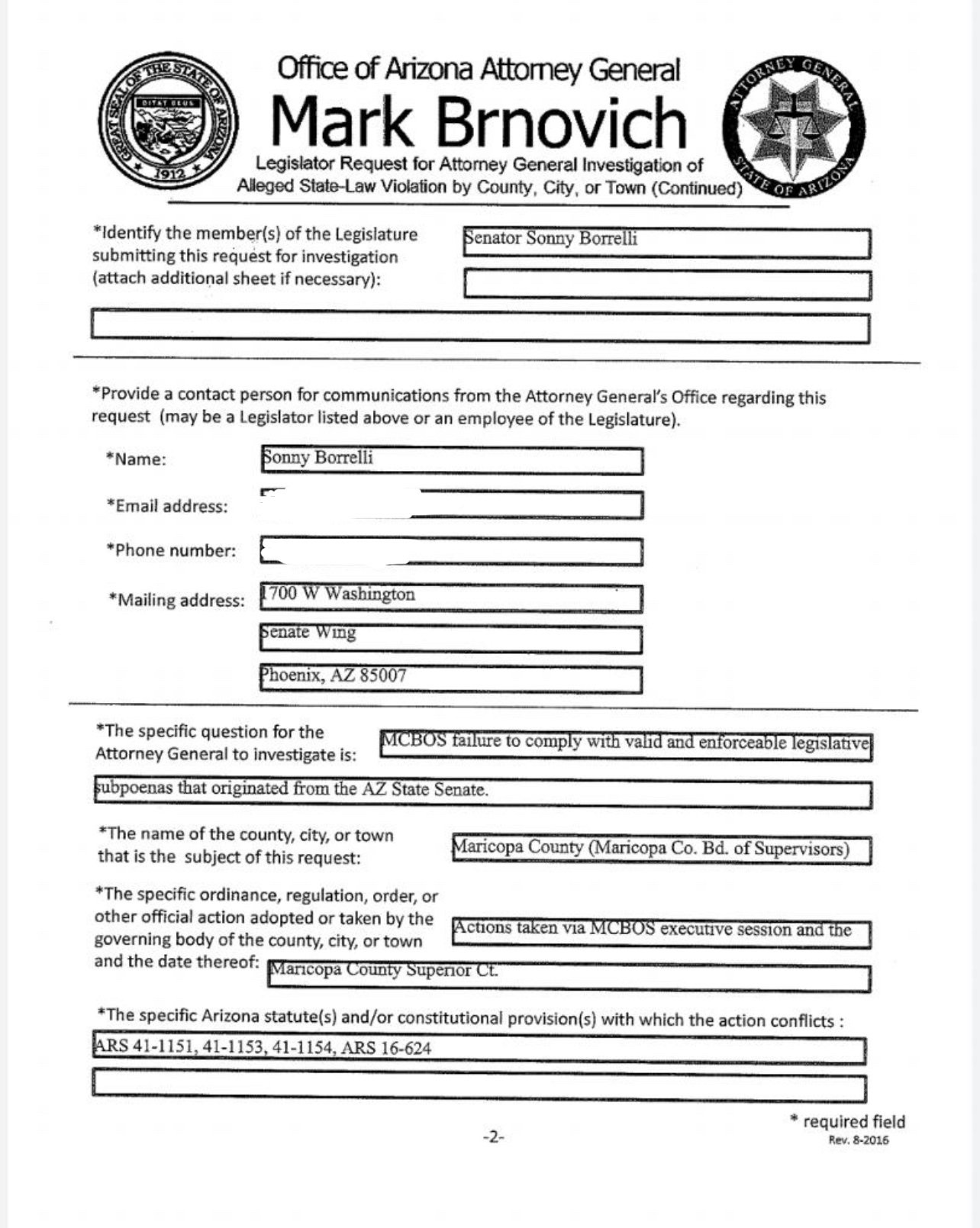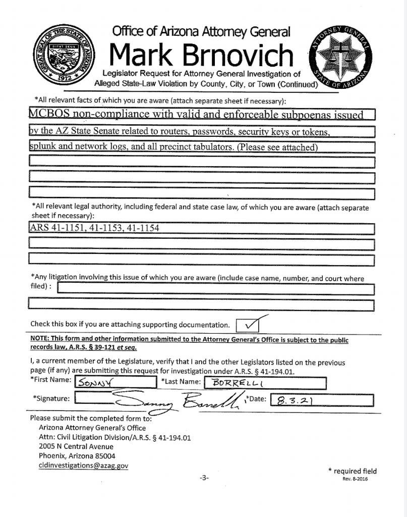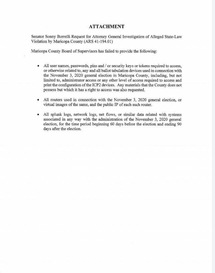 La SB 1487 de Arizona, presentada por el congresista Andy Biggs durante su tiempo como senador estatal de Arizona, da a cualquier miembro de la legislatura el poder de promulgar una investigación por parte de la oficina del Fiscal General sobre violaciones de la ley por parte de un condado, ciudad o pueblo.