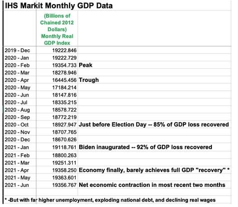 Más concretamente, como se ve en el gráfico a continuación, la economía se estancó claramente en mayo y junio, hasta el punto en que la narrativa de IHS reconoció (la audaz mía, cursiva suya) que «el nivel del PIB en junio estaba en realidad un 0,1% por debajo del promedio del segundo trimestre a una tasa anual».Lo que también es evidente es que el presidente Trump devolvió la economía al 92% de su máximo anterior antes de dejar el cargo.