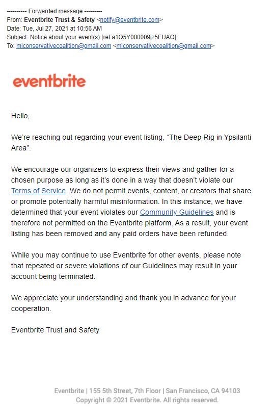 En una guerra continua contra los conservadores tras las elecciones de 2020, Eventbrite, el planificador corporativo de entradas y eventos, la semana pasada, eliminó una proyección de película conservadora de la película «Deep Rig» de Patrick Byrne en Michigan. Este documental alega ser una prueba más del fraude electoral en las muy disputadas elecciones presidenciales de 2020. Se cancelaron 150 entradas, se reembolsaron sin previo aviso y se eliminó toda la información de la cuenta.