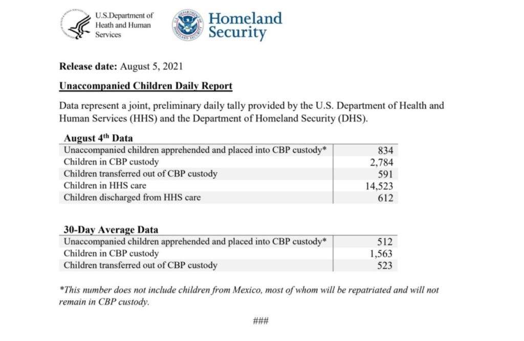 La Oficina de Aduanas y Protección de Fronteras de Estados Unidos (CBP) interceptó un total de 834 menores no acompañados en la frontera entre Estados Unidos y México el miércoles 4 de agosto, la cifra más alta desde que el gobierno de Biden comenzó a publicar un recuento diario de las aprehensiones de niños a principios de este año.