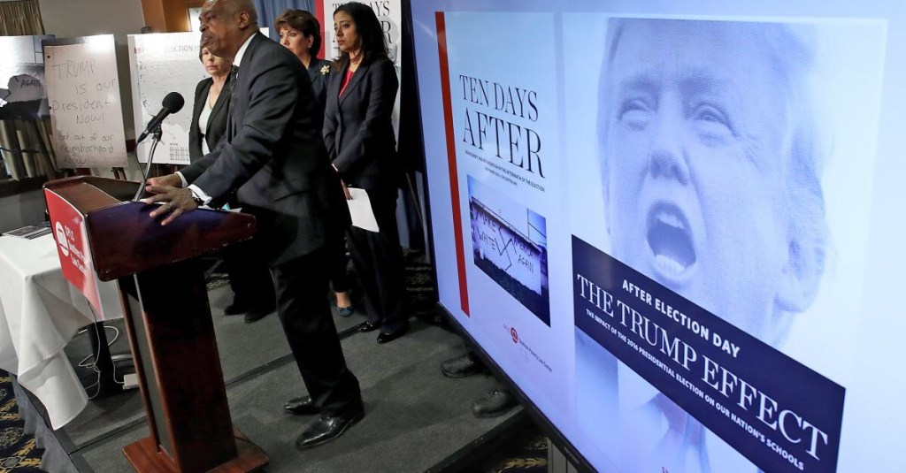 Aunque es una organización sin fines de lucro 501c3 que se supone que debe evitar la política directa , el SPLC se opuso abiertamente a Trump y sus políticas desde el comienzo de su mandato hasta sus últimos días en el cargo. Su posición fue declarada abiertamente en una campaña que realizó para que los estadounidenses firmen una petición en línea exigiendo que el 45º presidente de Estados Unidos acepte la responsabilidad de la supremacía blanca.