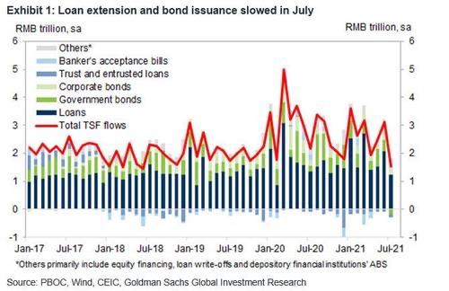 Según Goldman, la desaceleración de los préstamos TSF y RMB probablemente reflejó la débil demanda de crédito en medio de regulaciones más estrictas sobre la propiedad, LGFV y crédito al consumo (a través de regulaciones sobre plataformas de préstamos en línea), ya que las tasas de interés en general bajaron en el mes después del amplio recorte del RRR a mediados de mes. También han contribuido interrupciones como el brote de virus y medidas de control relacionadas, inundaciones y tifones.