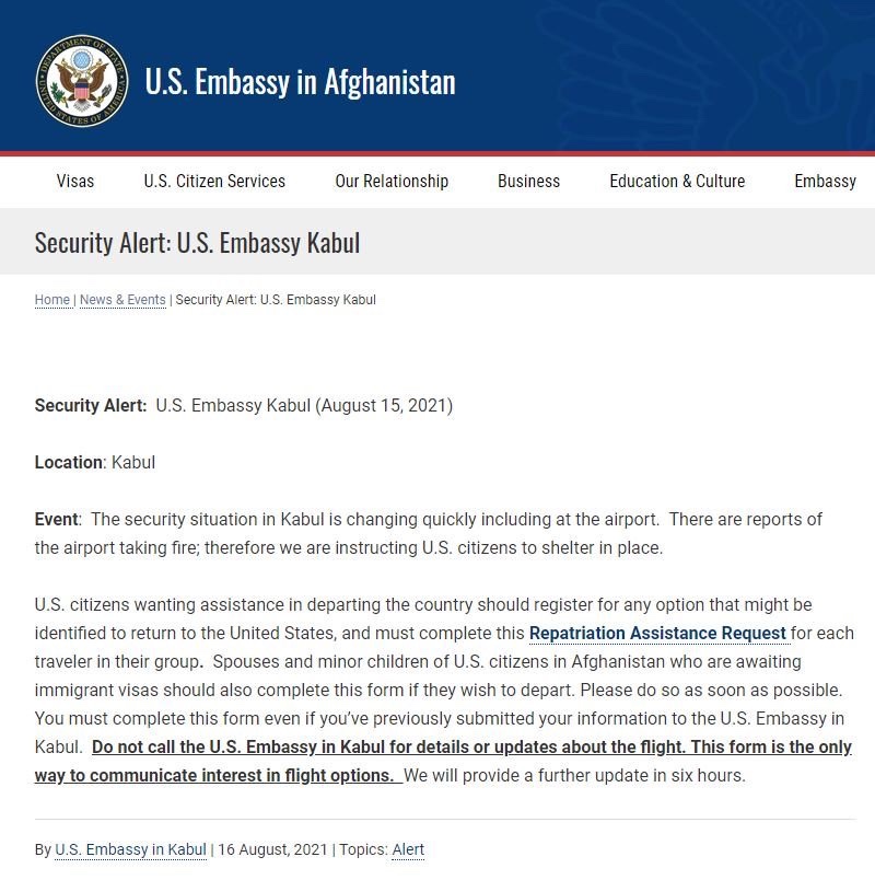Evento: La situación de seguridad en Kabul está cambiando rápidamente, incluso en el aeropuerto. Hay informes de que el aeropuerto se incendia; por lo tanto, estamos instruyendo a los ciudadanos estadounidenses para que se refugien en su lugar.
