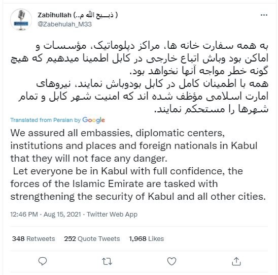 Majahid ha tuiteado a los terroristas talibanes que irrumpen en Kabul.