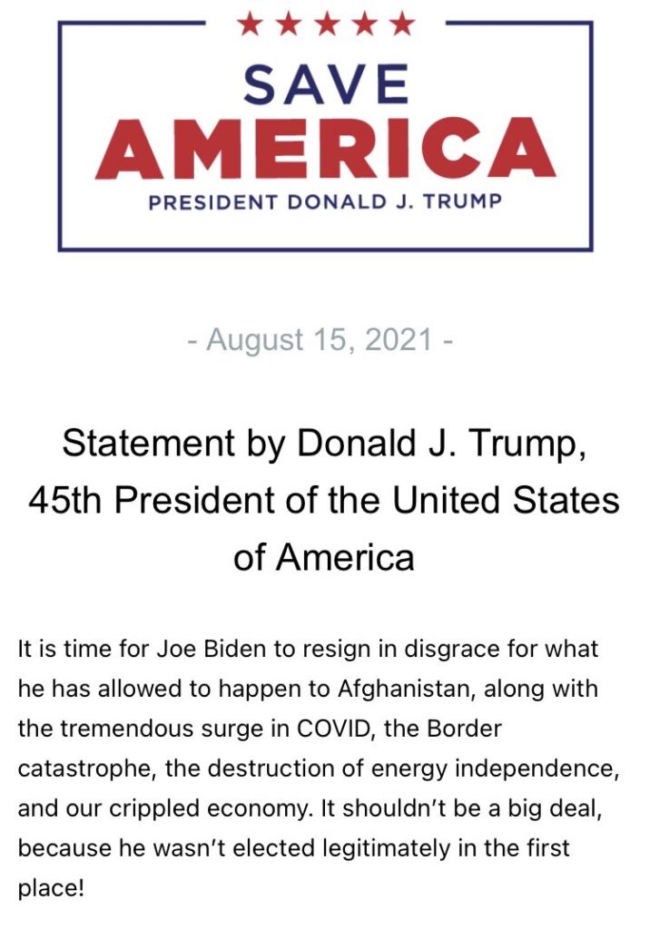 «Es hora de que Joe Biden renuncie en desgracia por lo que ha permitido que suceda en Afganistán, junto con el tremendo aumento de COVID, la catástrofe fronteriza, la destrucción de la independencia energética y nuestra economía paralizada. ¡No debería ser gran cosa, porque no fue elegido legítimamente en primer lugar!», dijo Trump.