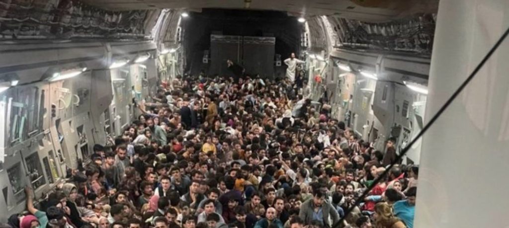 El reportero de la Casa Blanca se refiere a imágenes desgarradoras de afganos frenéticos que cooperaron con la ocupación estadounidense de su país que estaban varados en el Aeropuerto Internacional de Kabul mientras los talibanes cerraban. Muchos de los afganos que no llegaron a los aviones de transporte fueron ejecutados por los talibanes.