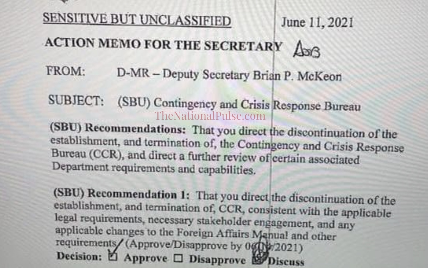 El documento es del escritorio del Secretario de Estado Adjunto Brian P. McKeon, confirmado en marzo por el Senado de los Estados Unidos.