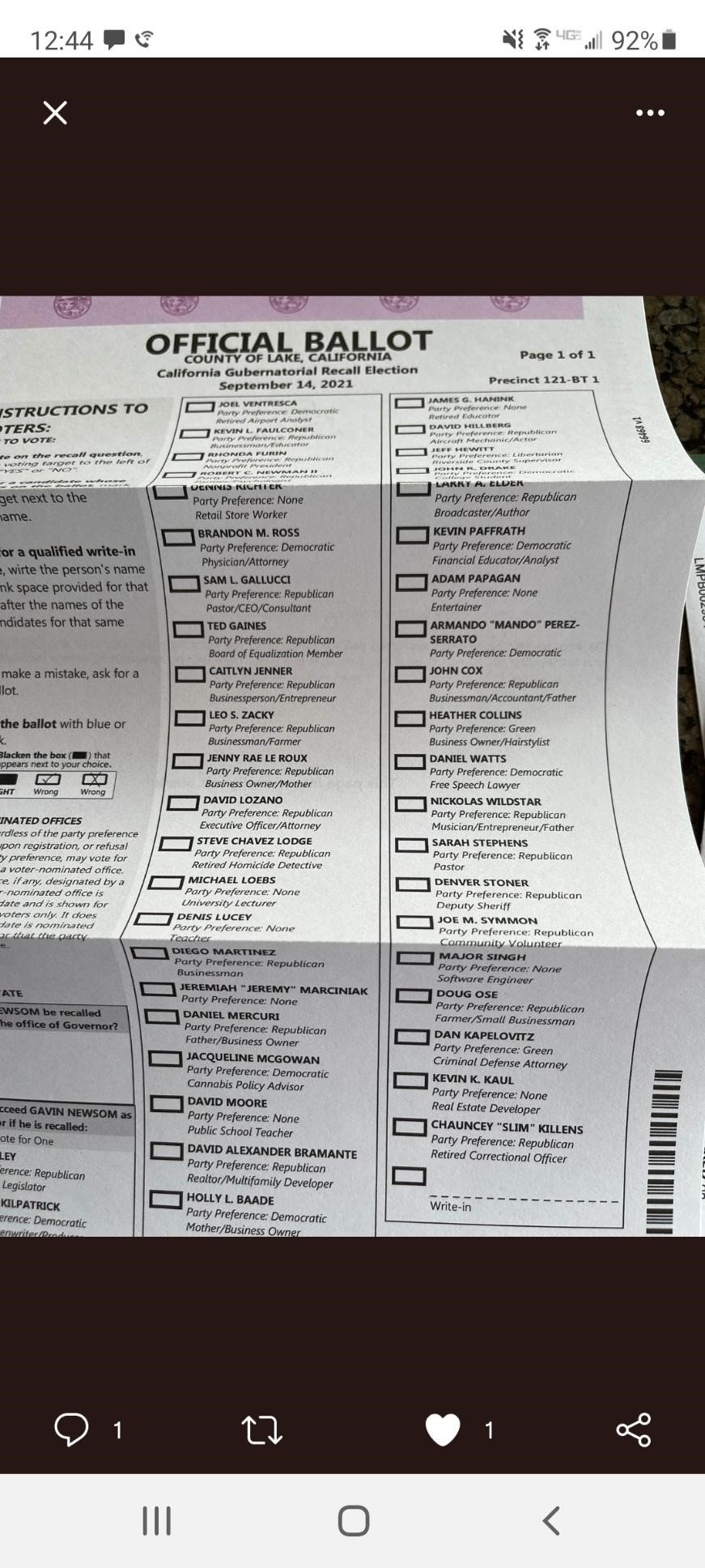 En este primer ejemplo, el candidato republicano Larry Elder se ve notablemente afectado por la forma en que se creó la boleta y se agregaron pliegues a la boleta. Este es un hackeo de baja tecnología de una boleta electoral.