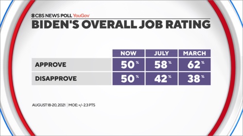 El índice de aprobación general de Biden, que había sido consistentemente positivo neto desde que asumió el cargo, también recibió un golpe, cayendo ocho puntos y ahora cae en un nivel de 50-50 en todo el país.