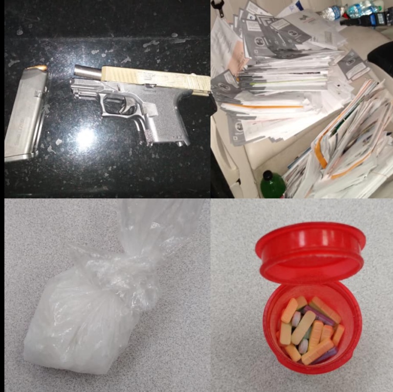 Después de que el oficial no obtuviera una respuesta del hombre en el vehículo, el oficial investigó más a fondo la situación y pudo encontrar un brazo de arma de fuego cargada, Xanax, metanfetamina y «correo».