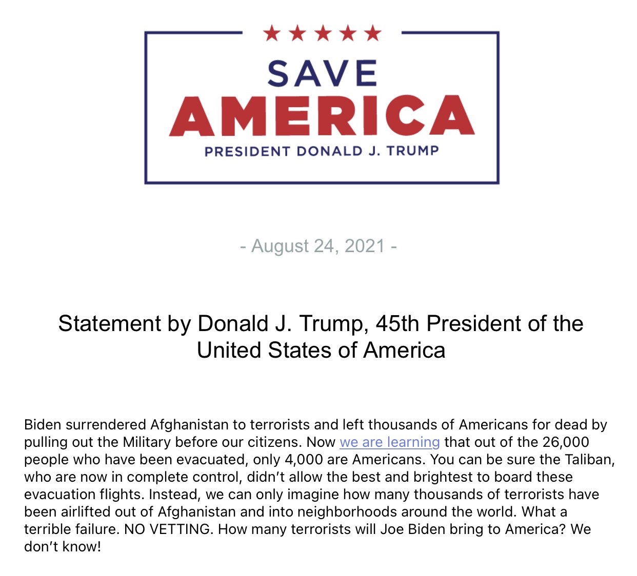 El expresidente Trump criticó el manejo inquebral de Joe Biden de la retirada de Afganistán, en particular su decisión de evacuar a más civiles afganos que estadounidenses varados e importarlos a Estados Unidos.