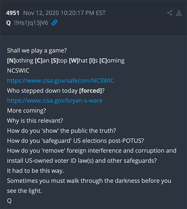 Advirtieron a los patriotas que Biden sería presidente, que ocurriría un evento de miedo necesario, que teníamos que caminar por la oscuridad para ver la luz, que las elecciones serían robadas y que una entidad extranjera tomaría el control de la Casa Blanca. Incluso se predijo el ataque al Congreso y el intento de destitución.