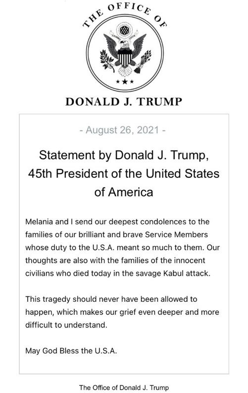 Donald Trump, 45o Presidente de los Estados Unidos, acaba de emitir una declaración sobre el asesinato de al menos 12 militares estadounidenses en múltiples explosiones en Kabul, Afganistán.