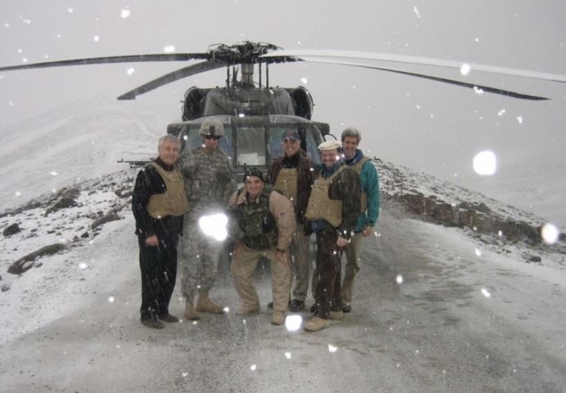 Septiembre de 2008 y la foto muestra al Secretario de Defensa de EE. UU. Chuck Hagel, al Vicepresidente Joe Biden y al nuevo Secretario de Estado John Kerry sonriendo después de ser rescatados en una tormenta de nieve detrás de las líneas enemigas en Afganistán. (Infoknomon Politics)