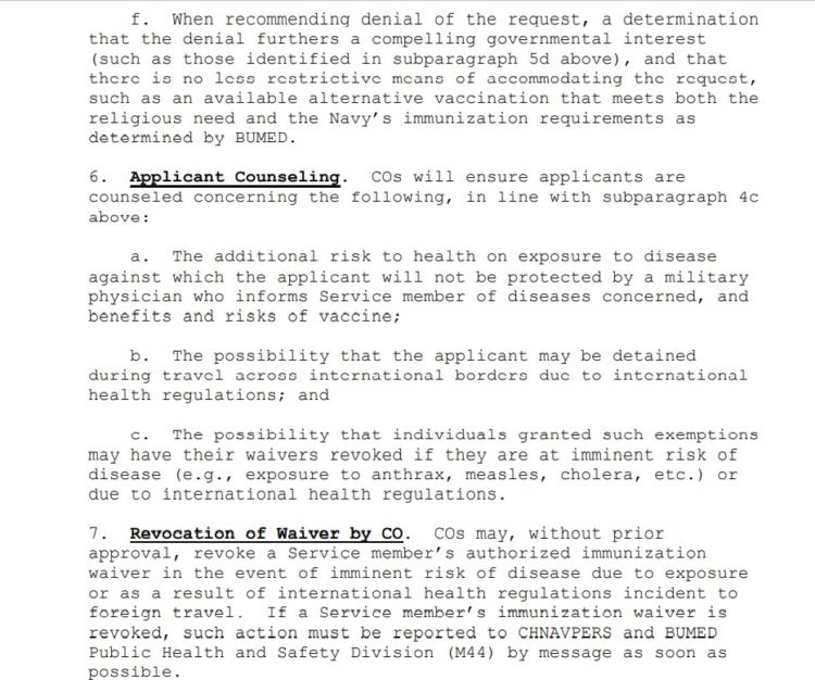Los marineros que quieren las exenciones religiosas tienen que someterse a un «Asesoramiento al solicitante» que los entrena sobre «El riesgo adicional para la salud en la exposición a una enfermedad contra la que el solicitante no estará protegido por un médico militar que informe al miembro del servicio de la enfermedad en cuestión, y los beneficios y riesgos de la vacuna»; y «La posibilidad de que el solicitante pueda ser detenido durante un viaje a través de las fronteras internacionales debido a las regulaciones sanitarias internacionales» y «La posibilidad de que a las personas a las que se les concedan dichas exenciones se les revoquen sus exenciones si están en riesgo inminente de enfermedad (por ejemplo, exposición al ántrax, sarampión, cólera, etc.) o debido a regulaciones de salud».