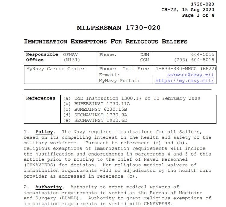 El DOCUMENTO MARINO 1 del 15 de agosto de 2020 se titula «EXENCIONES DE INMUNIZACIÓN PARA CREENCIAS RELIGIOSAS». El documento establece que un comandante puede suspender una exención religiosa «si es necesario debido a una amenaza inminente a la salud o la seguridad».
