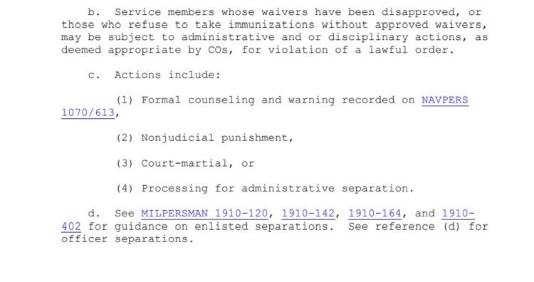 Un documento de la Marina de agosto de 2020 advierte que los marineros se enfrentan al consejo de guerra si rechazan las vacunas sin tener «documentos aprobados» para obtener una exención religiosa, que es un proceso prolongado según el documento. El documento dice (énfasis añadido):«Acciones administrativas y disciplinarias a. De acuerdo con la referencia (a), los miembros del servicio que presenten solicitudes de adaptaciones religiosas cumplirán con la política, práctica u obligación de la que solicitan alojamiento, a menos que o hasta que se apruebe la solicitud. b. Los miembros del servicio cuyas exenciones han sido rechazadas, o aquellos que se niegan a tomar vacunas sin exenciones aprobadas, pueden estar sujetos a acciones administrativas y/o disciplinarias, según lo consideren apropiado los OC, por violación de una orden legal. c. Las acciones incluyen: (1) Asesoramiento formal y advertencia registrada en NAVPERS 1070/613, (2) Castigo no judicial, (3) Consejo de guerra, o (4) Tramitación para separación administrativa. d. Véase MILPERSMAN 1910-120, 1910-142, 1910 164 y 1910-402 para obtener orientación sobre las separaciones alistadas. Véase la referencia d) para las separaciones de oficiales»
