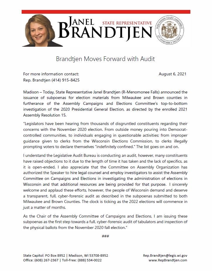 Representante Estatal. Janel Brandtjen emitió citaciones a los secretarios electorales en los condados de Milwaukee y Brown el 6 de agosto ordenándoles comparecer ante su comité al mediodía del martes con el material solicitado. Pero la Fiscal del Condado de Milwaukee Margaret Daun dijo en una carta a Brandtjen el viernes que la citación no era válida porque no fue firmada por el Presidente de la Asamblea Robin Vos o el secretario jefe de la Asamblea, como lo requiere la ley.