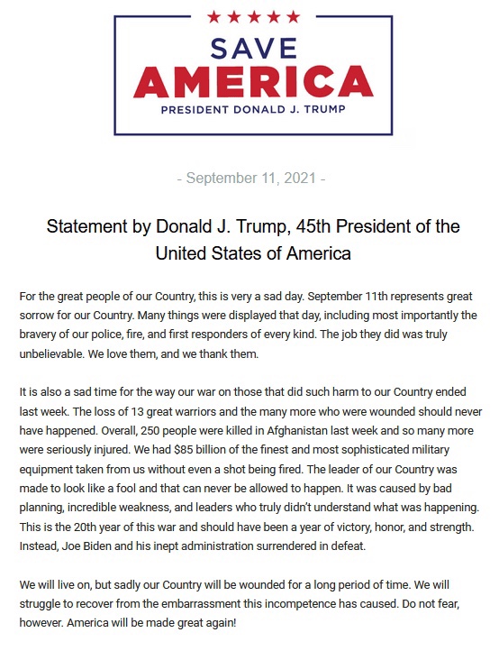 Expresando aún más desprecio por el manejo de Joe Biden de la retirada de Afganistán, el presidente Trump agregó: «Este es el vigésimo año de esta guerra, y debería haber sido un año de victoria, honor y fuerza. En cambio, Joe Biden y su inepto gobierno se rindieron en derrota. Seremos viviendo, pero lamentablemente nuestro país estará herido durante un largo período de tiempo. Lucharemos por recuperarnos de la vergüenza que esta incompetencia ha causado». El presidente Trump concluyó con otra indicación de que tiene la intención de postularse para presidente en 2024: «No temas, sin embargo, Estados Unidos volverá a ser grande».