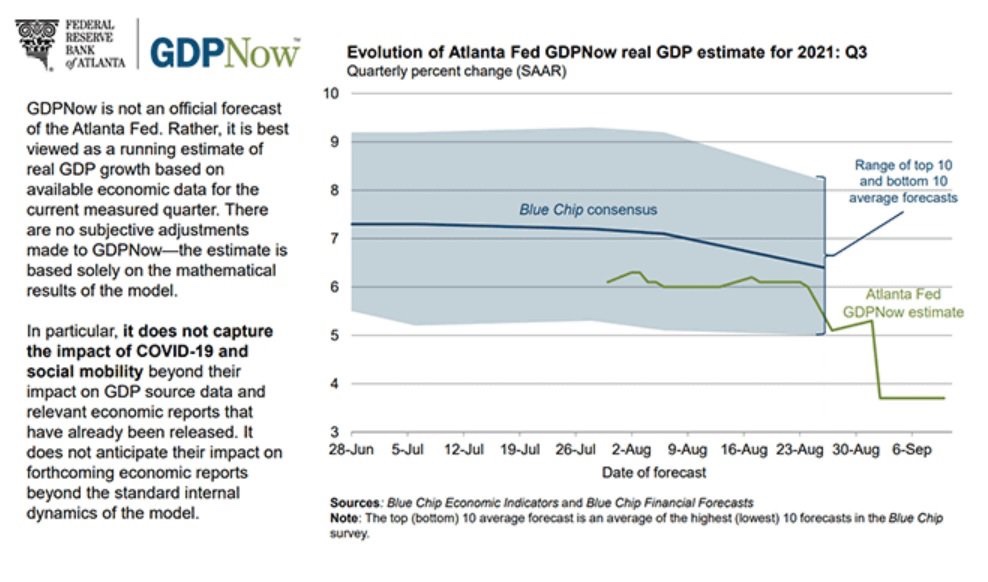 Oh, cómo han cambiado los tiempos bajo el régimen de Biden. La FED de Atlanta ha ajustado a la baja sus expectativas para la economía en el tercer trimestre en un 40%. Donde la estimación del PIB para el tercer trimestre de 2021 estaba por encima del 6%, ahora está ligeramente por encima del 3%.