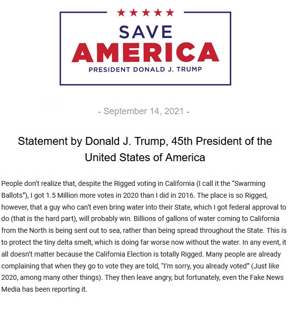 El 45o presidente Donald Trump ha emitido una declaración prediciendo que la elección revocatoria de California será amañada a favor del actual gobernador demócrata. Gavin Newsom, y citó informes creíbles de fraude electoral que ya han aparecido en los titulares antes de que se hayan contado las votaciones.