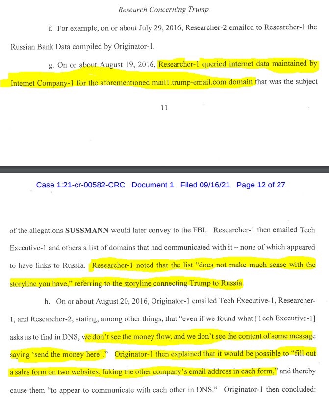 Las notas dicen además que Sussmann identificó la fuente del engaño del Banco Alfa como tres ciudadanos preocupados en el sector tecnológico, lo que fue una mentira aparente, ya que ninguno de ellos parece haber tenido nada que ver con la investigación o redacción del libro blanco. Según Durham, los autores reales del artículo fueron Tech Executive-1, el creador del engaño, dos investigadores informáticos y el propio Sussmann.