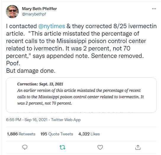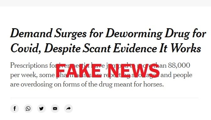 Y en el artículo, The New York Times afirmó que un centro de control de intoxicaciones de Mississippi informó de un aumento del 70% en las recientes intoxicaciones por Ivermectina.