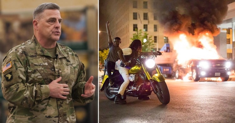 Extractos de un nuevo libro llamado «Peril» que fue escrito por los reporteros de Watergate afirman que el activista de izquierda general Mark Milley se puso del lado de los alborotadores de Black Lives Matter contra el Presidente de los Estados Unidos durante los violentos disturbios de George Floyd, diciéndole al presidente Donald Trump que la «brutalidad policial» Presidente, eso no es una insurrección».