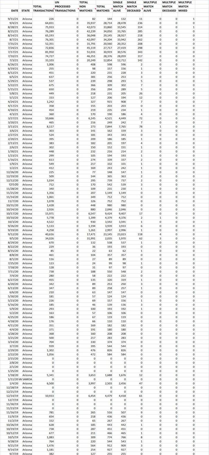 La friolera de 393.017 no tuvo un partido de los 673.560. De hecho, el procesamiento semanal de Arizona tiene uno de los porcentajes de no partidos más altos del país, normalmente entre el 50% y el 65%. En la mayoría de los demás Estados esta proporción es del 15% al 25%.