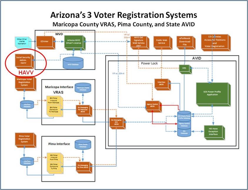 La imagen de abajo muestra los únicos 3 sistemas de registro de votantes en Arizona y muchas de las interfaces. Esto incluye el sistema VRAS de Maricopa, el sistema del condado de Pima y el sistema estatal llamado AVID utilizado por todos los demás condados. La interfaz HAVV procesa datos a través del MVD. Debido a esto, no está claro cuál de estos 3 sistemas de registro de votantes está empujando esta enorme cantidad de solicitudes de verificación de identificación a la SSA.
