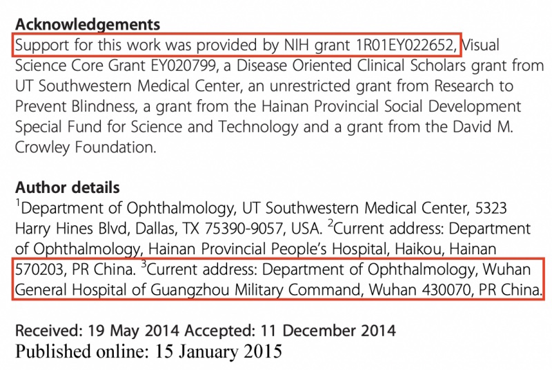 Un estudio de 2015 – «Diferencias en la distribución, fenotipo y expresión génica de la microglia/macrófagos subretinianos en ratones C57BL/6N (Crb1 rd8/rd8) versus C57BL6/J (Crb1 wt/wt)» – señala que «el apoyo para este trabajo fue proporcionado por la subvención de los NIH 1R01EY022652» además de incluir como autor a un investigador del Hospital General de Wuhan del Comando Militar de Guangzhou.