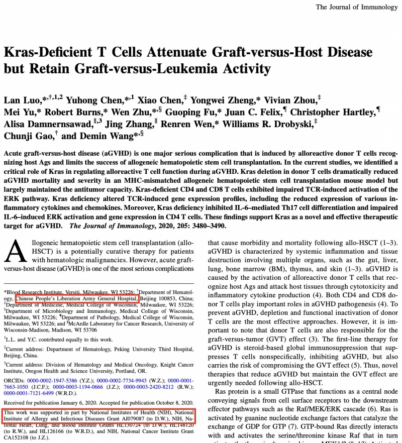 Un estudio – «Las células T con deficiencia de Kras atenúan la enfermedad de injerto contra huésped pero retienen la actividad de injerto contra leucemia» – tiene dos investigadores del Hospital General del EPL nombrados como autores, al tiempo que señala que «este trabajo fue apoyado en parte por los Institutos Nacionales de Salud (NIH), la subvención AI0790