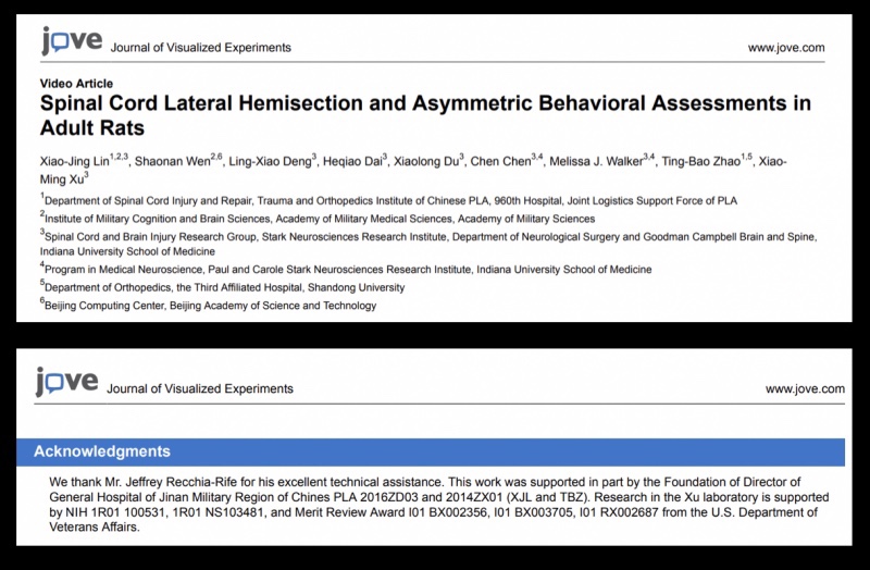 Ejemplos de estudios incluyen «Hemisección lateral del cordón espinal y evaluaciones asimétricas del comportamiento en ratas adultas», que incluye a dos investigadores del 960o Hospital PLA bajo la Fuerza Conjunta de Apoyo Logístico del ejército a pesar de recibir fondos de los NIH y los EE. UU. Departamento de Asuntos de Veteranos.