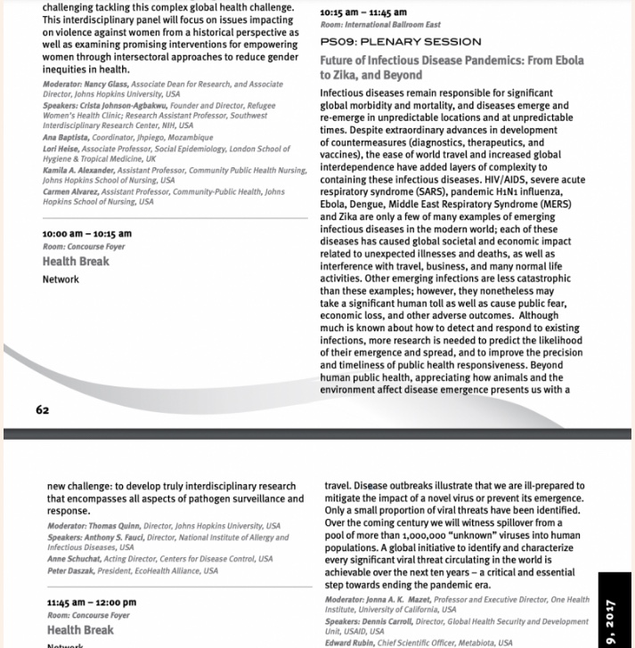 El evento de 2017, la conferencia «Gente sana, ecosistemas saludables» organizada por el Consorcio de Universidades para la Salud Global (CUGH), tuvo lugar en Washington, D.C. En su descripción de la conferencia, CUGH señala que la conferencia apoya su visión de un «mundo sin fronteras»: