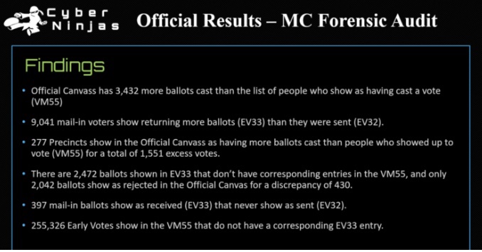 Doug Logan, CEO de Cyber Ninjas, la firma que dirigió la auditoría forense de los resultados electorales del condado de Maricopa en 2020, reveló graves problemas con los formularios de votación, los votos y otros, y como señaló la senadora estatal de Trump Wendy Rogers, el número de errores descubiertos es «mucho más de 10 000 votos necesarios para voltear las elecciones».