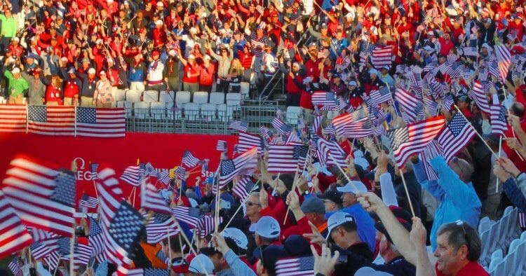 En la demostración patriótica de apoyo al equipo de EE. UU., cientos de aficionados al golf de EE. UU. ondearon sus banderas y cantaron como sinónimos «The Star-Spangled Banner». El periodista de golf Adam Stanley tuiteó un vídeo que capturó la exhibición jubilosa.